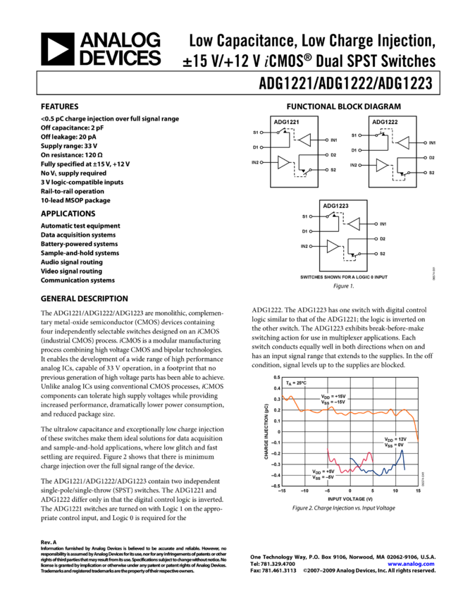 ADG1222: Low Capacitance, Low Charge Injection, ±15 V/+12 V CMOS® Dual SPST Switch