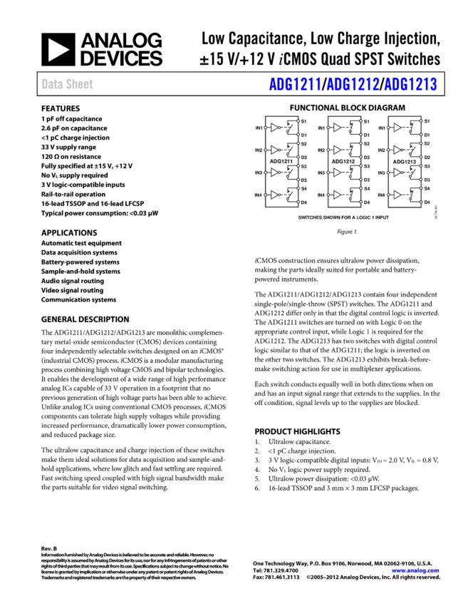 ADG1213: Low Capacitance, Low Charge Injection, ±15 V/+12 V iCMOS Quad SPST Switch