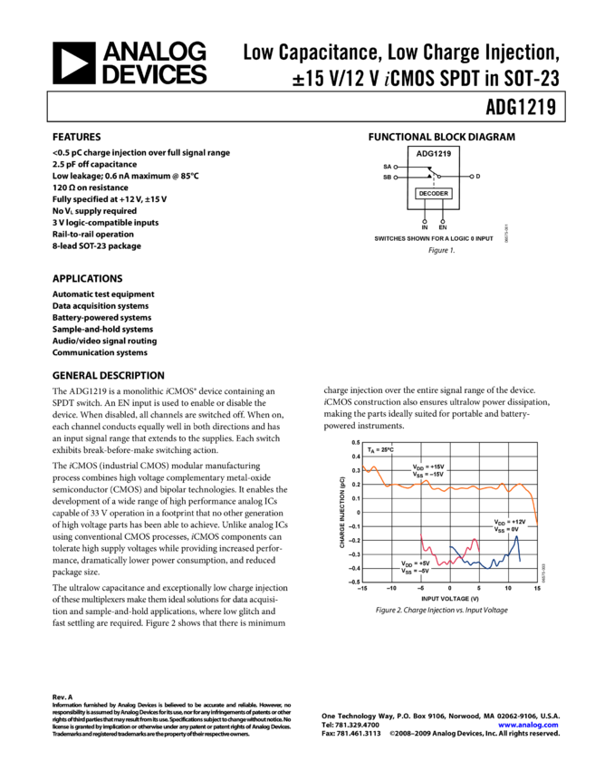 ADG1219: Low Capacitance, Low Charge Injection, ±15 V/12 V CMOS® SPDT in SOT-23