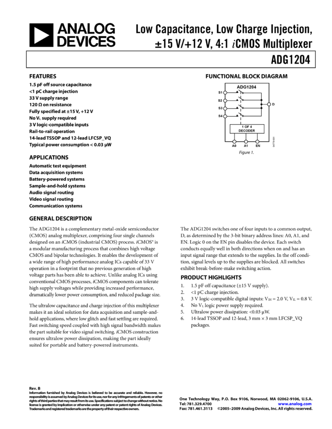 ADG1204: Low Capacitance, Low Charge Injection, CMOS™ ± 15/12 V 4:1 Multiplexer