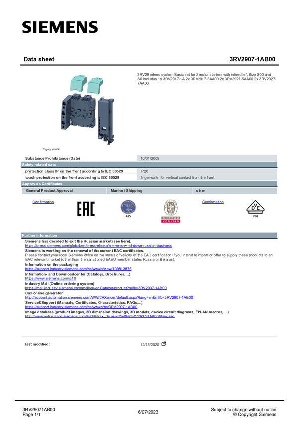 Złącze instalacyjne Siemens 3RV2907-1AB00 1 szt.