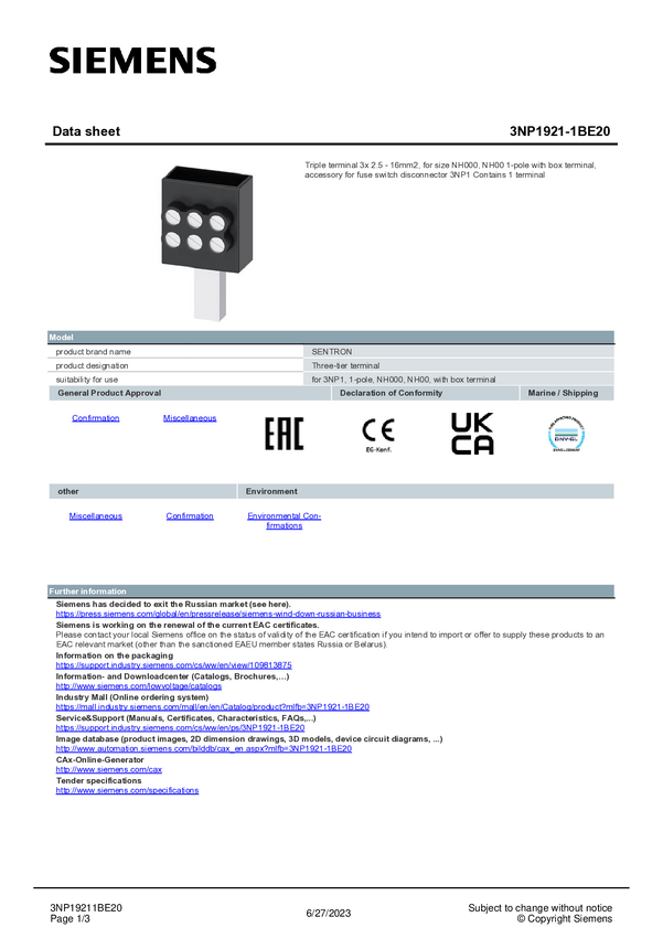 Złącze instalacyjne Siemens 3NP1921-1BE20 1 szt.