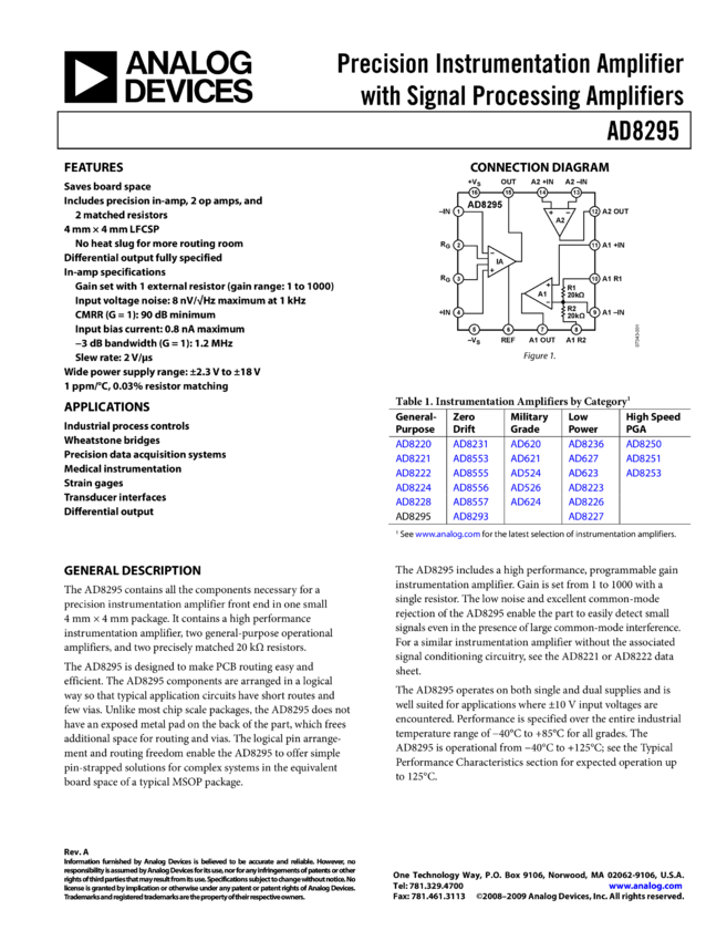 AD8295: Precision Instrumentation Amplifier with Signal Processing Amplifiers