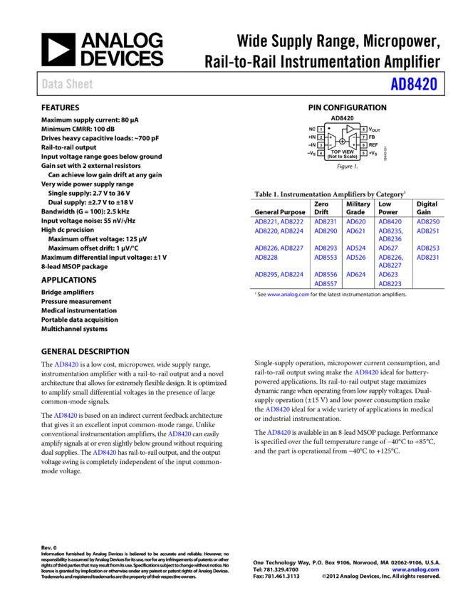 AD8420: Wide Supply Range, Micropower, Rail-to-Rail Instrumentation Amplifier