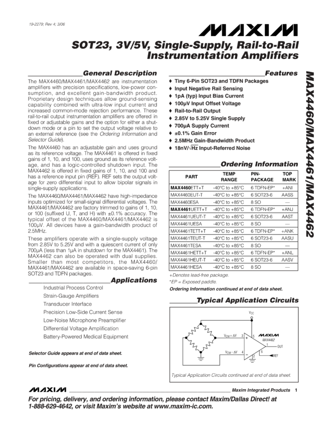 MAX4460, MAX4461, MAX4462 SOT23, 3V/5V, Single-Supply, Rail-to-Rail Instrumentation Amplifiers