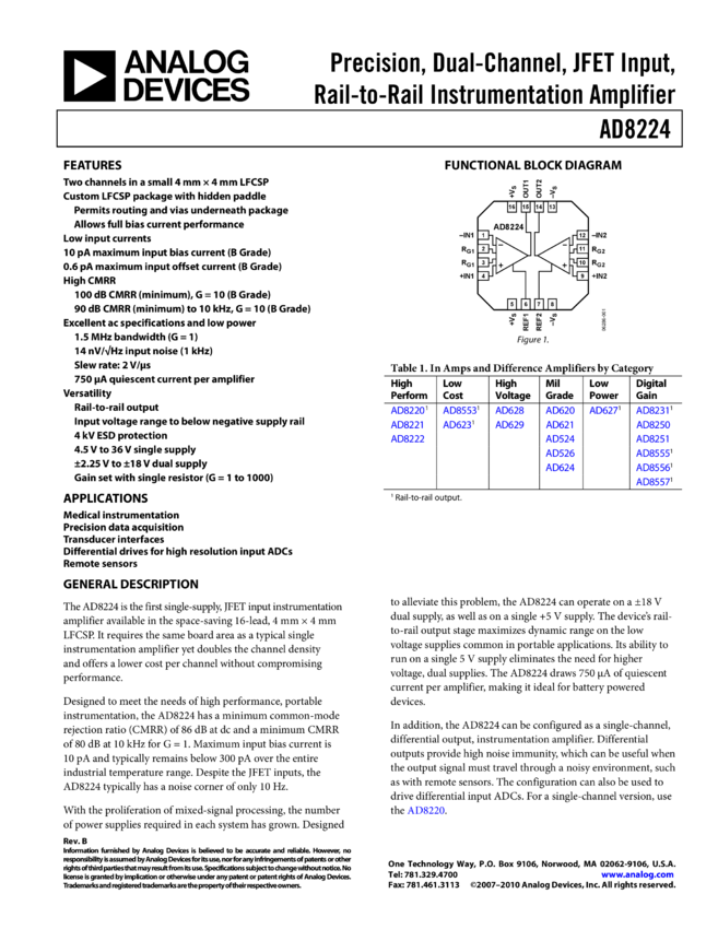 AD8224: Precision, Dual-Channel, JFET Input, Rail-to-Rail Instrumentation Amplifier
