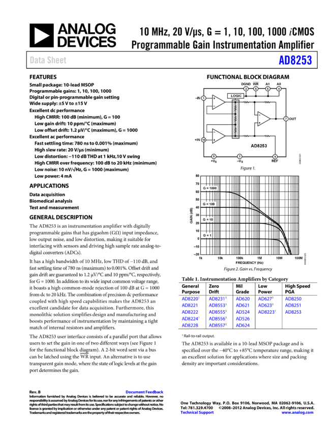 AD8253: 10 MH, G = 1, 10, 100, 1000 CMOS® Programmable Gain Instrumentation Amplifier