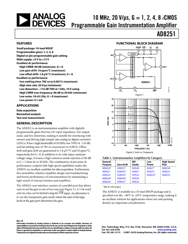 AD8251: 10 MH, G = 1, 2, 4, 8 CMOS® Programmable Gain Instrumentation Amplifier