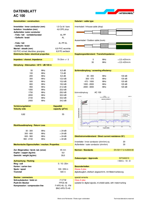 Kabel koncentryczny Interkabel AC 100-1, Średnica zewnętrzna: 6.90 mm, 75 Ω, 120 dB, biały, Produkty w metrach bieżących
