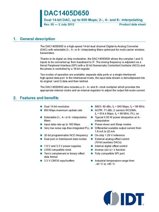 Dual 14-bit DAC, up to 650 Msps; 2x 4x and 8x interpolating