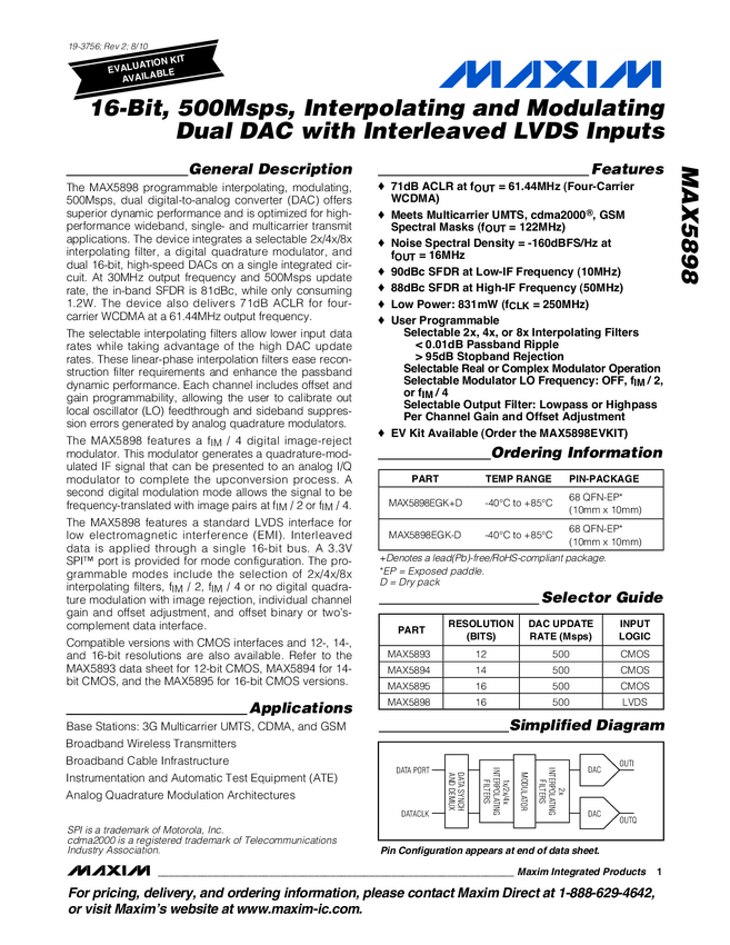16-Bit, 500Msps, Interpolating and Modulating Dual DAC with Interleaved LVDS Inputs