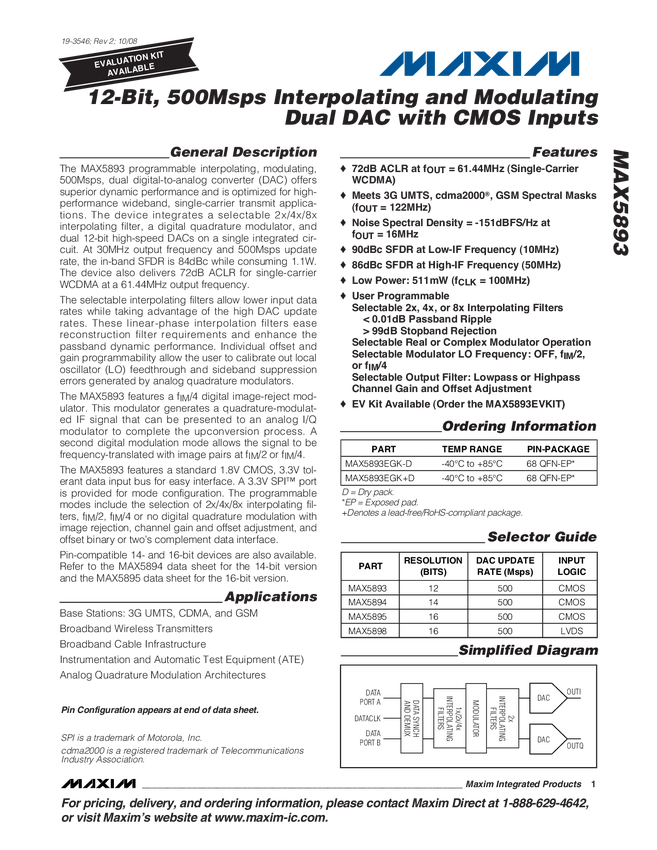 12-Bit, 500Msps Interpolating and Modulating Dual DAC with CMOS Inputs