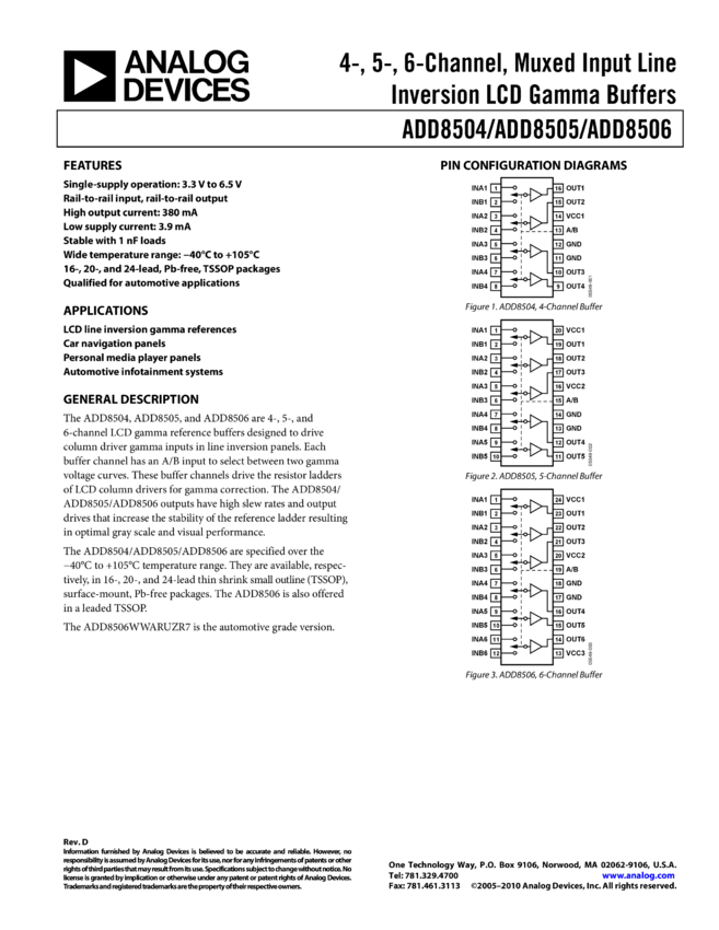 ADD8504: 4-Channel, Muxed Input Line Inversion LCD Gamma Buffer
