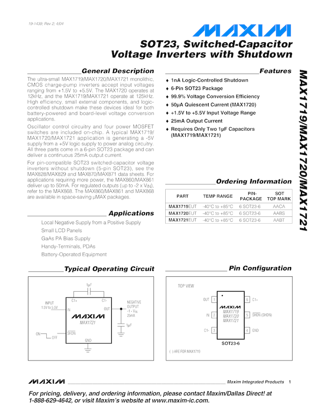 MAX1719, MAX1720, MAX1721 SOT23, Switched-Capacitor Voltage Inverters with Shutdown