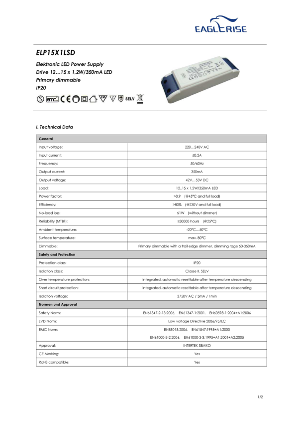 Zasilacz EagleRise 12-15x1LED, ściemnialny przy użyciu ściemniacza trail edge dimmer, , Uwyj=42-53V DC, do zasilania od 12 do 15szt. LED1W połączonych szeregowo, IP20