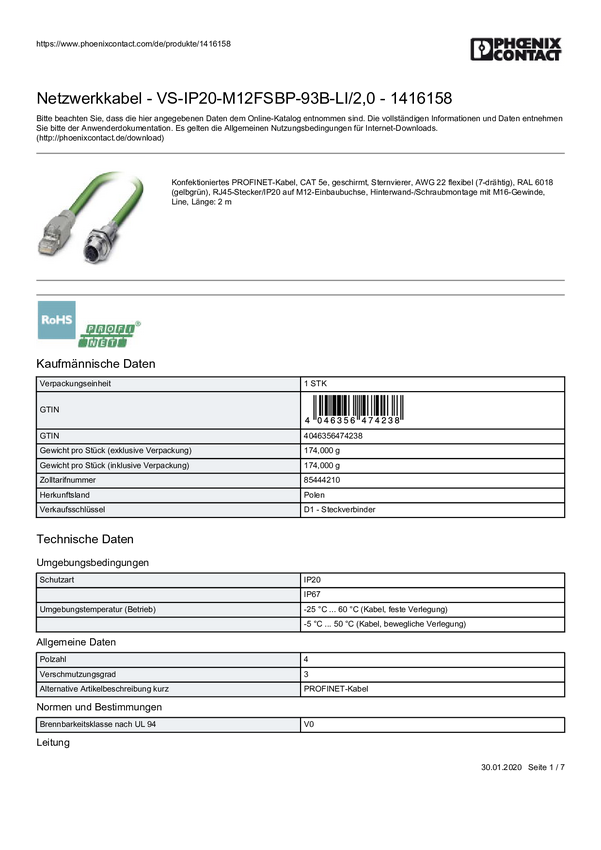 Phoenix Contact 1416158 Złącze czujnika/aktuatora VS-IP20-M12FSBP-93B-LI/2,0, piny: 4, 1 szt.