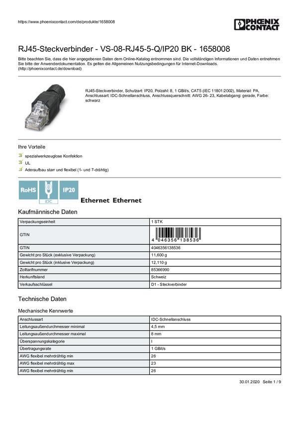 Phoenix Contact 1658008 Złącze RJ45 VS-08-RJ45-5-Q/IP20 BK, RJ45, CAT 5, piny:8, 1 szt.