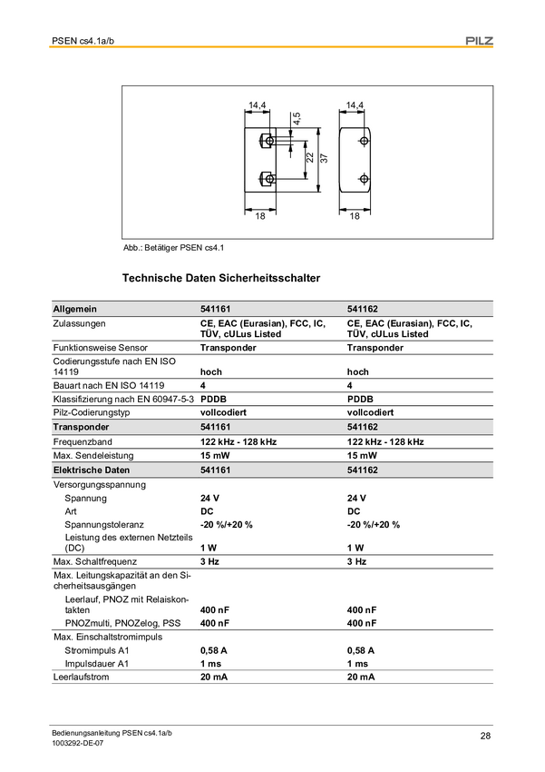 PILZ 541111 Wyłącznik bezpieczeństwa RFID PSEN cs4.1a /PSEN cs4.1, IP6K9K, 1 szt.