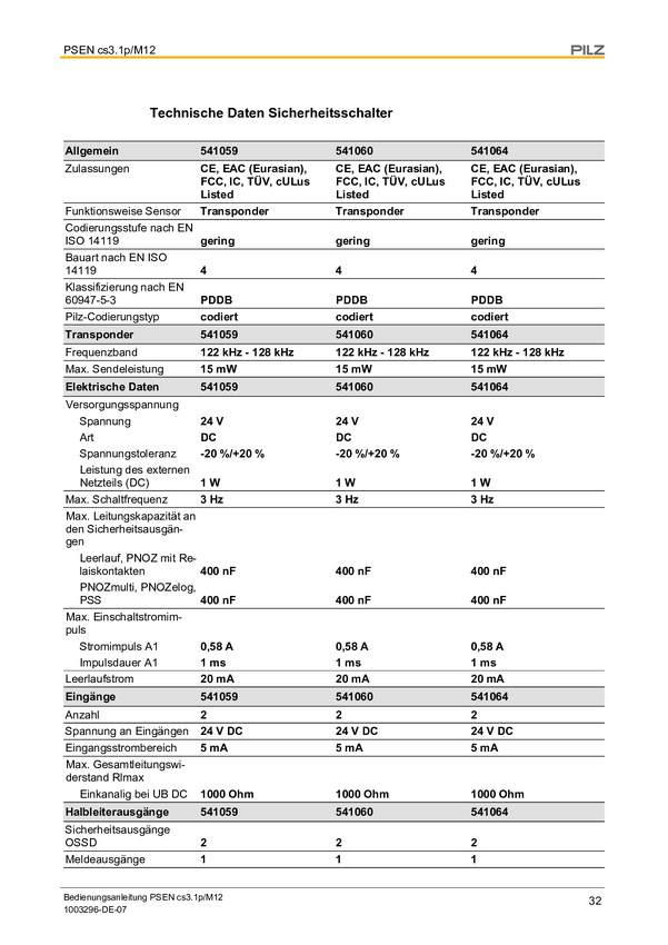 PILZ 541011 PSEN cs3.1a /PSEN cs3.1 Wyłącznik bezpieczeństwa RFID IP6K9K 1 szt.