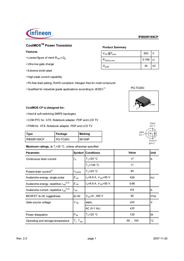 Trans MOSFET N-CH 550V 17A 3-Pin TO-263 T/R