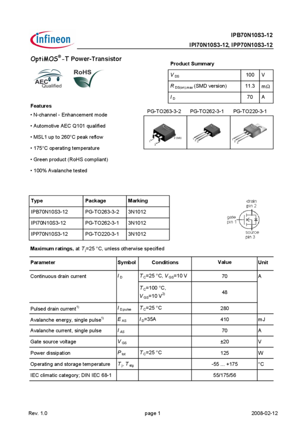 Trans MOSFET N-CH 100V 70A 3-Pin TO-263 T/R