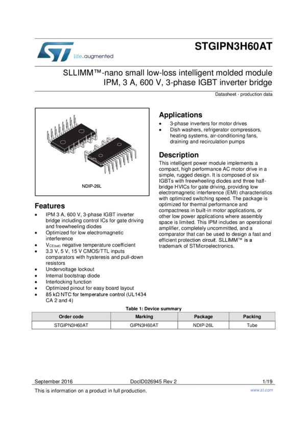 SLLIMM-nano small low-loss intelligent molded module IPM, 3 A, 600 V 3-phase IGBT inverter bridge