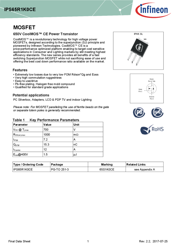 Trans MOSFET N-CH 700V 4.3A 3-Pin TO-251 Tube