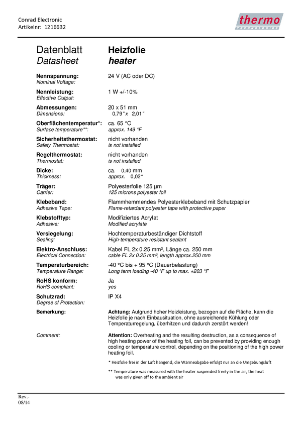 Thermo TECH poliester Folia grzewcza samoprzylepna 24 V/DC, 24 V/AC 1 W Certyfikat odporności IPX4 (D x S) 51 mm x 20 mm