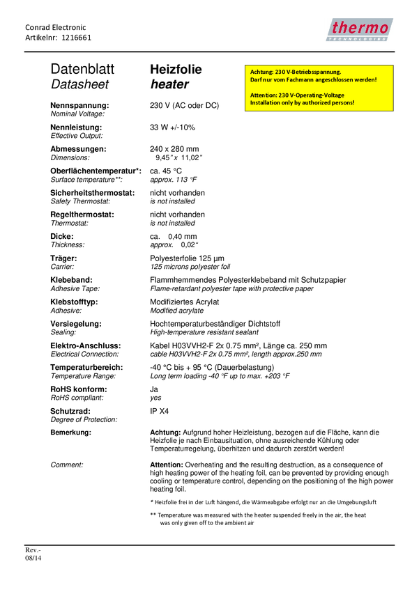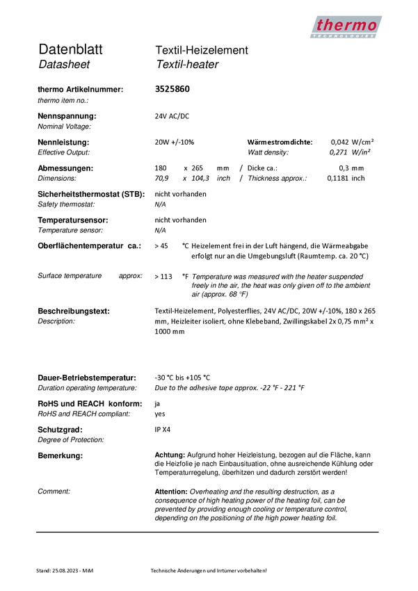 Thermo TECH 3525860 Folia grzewcza 3525860, 45 °C, 20 W, IPX4, (D x S) 265 mm x 180 mm