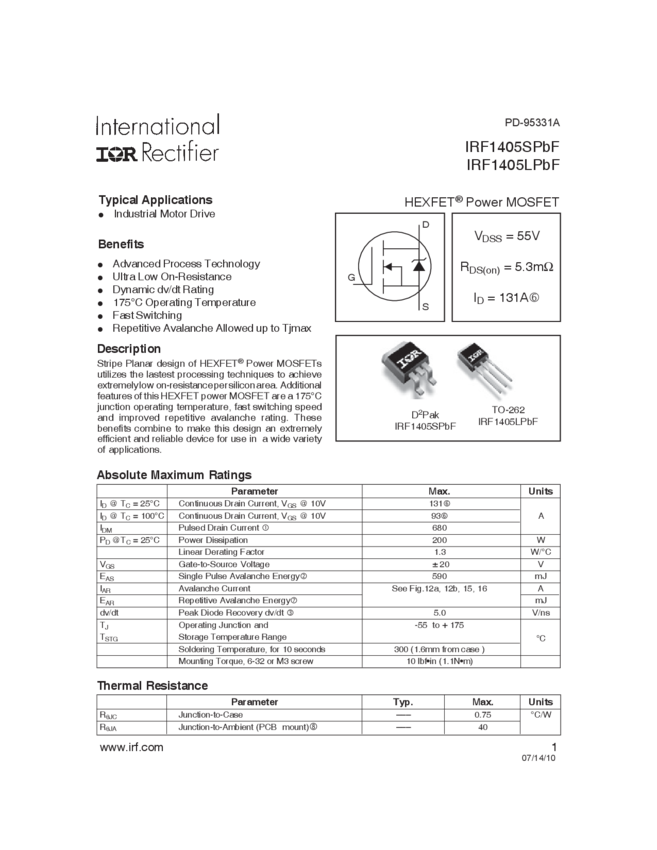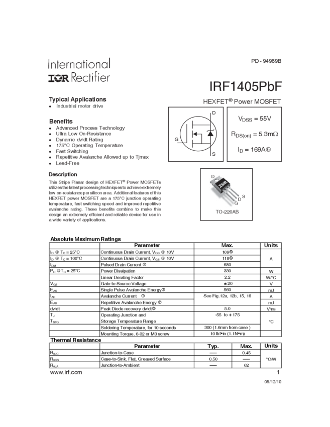 Tranzystor; IRF1405ZPBF; N-MOSFET; 150A; 55V; 230W; unipolarny; TO220AB; THT; INFINEON; RoHS