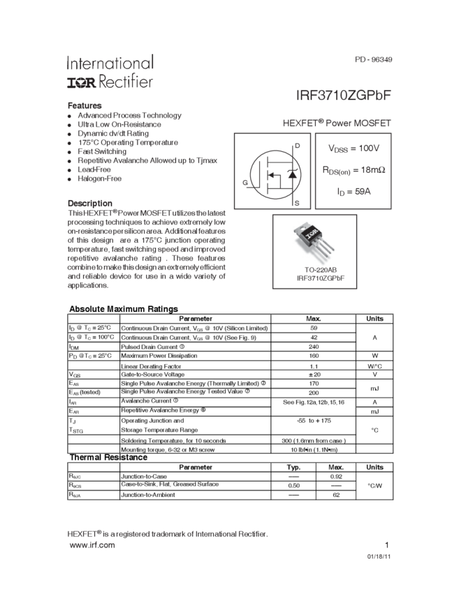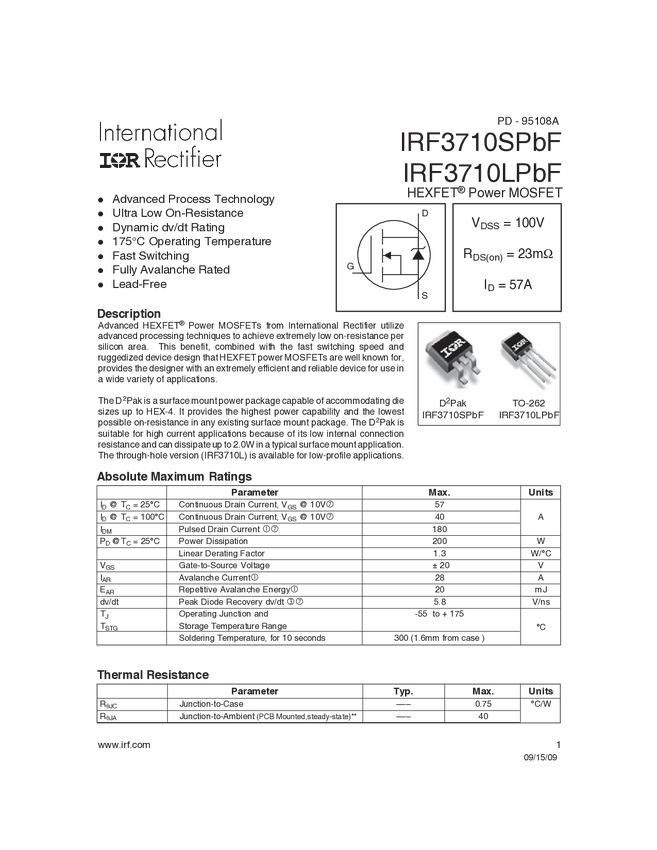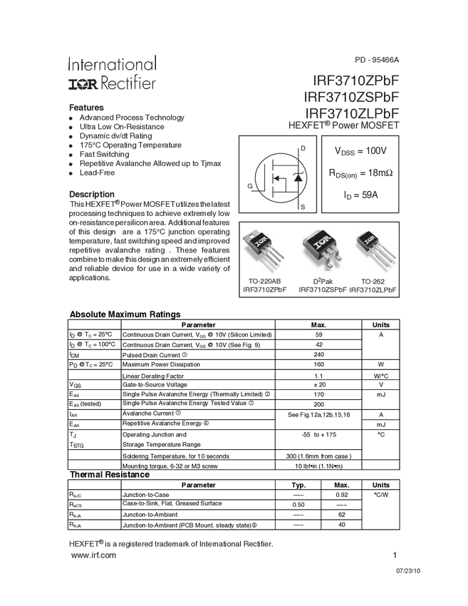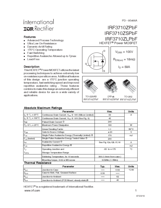 MOSFET Infineon Technologies IRF3710ZPBF N/A N/A IRF3710ZPBF