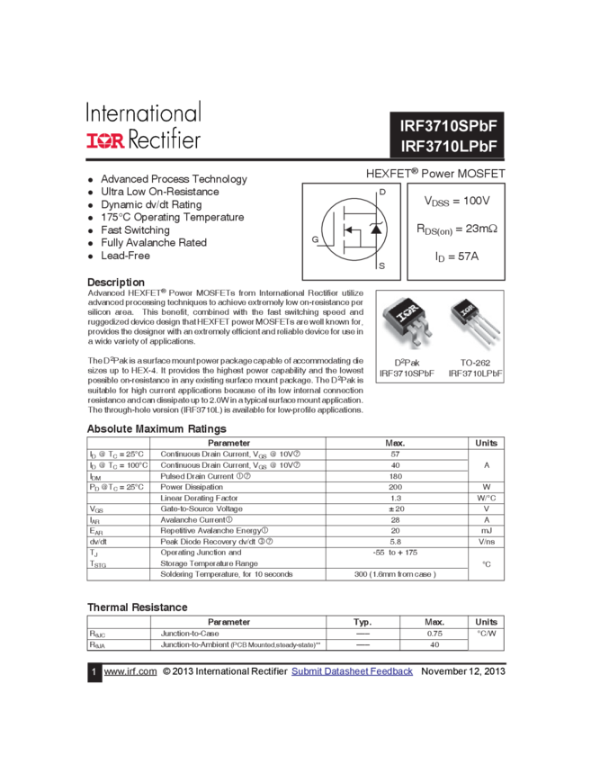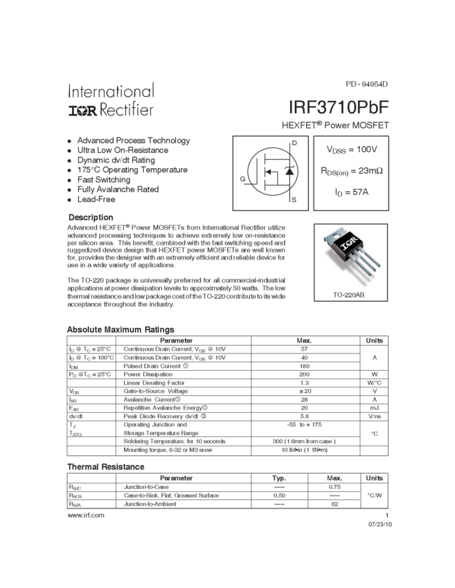 MOSFET Infineon Technologies IRF3710PBF N/A N/A IRF3710PBF