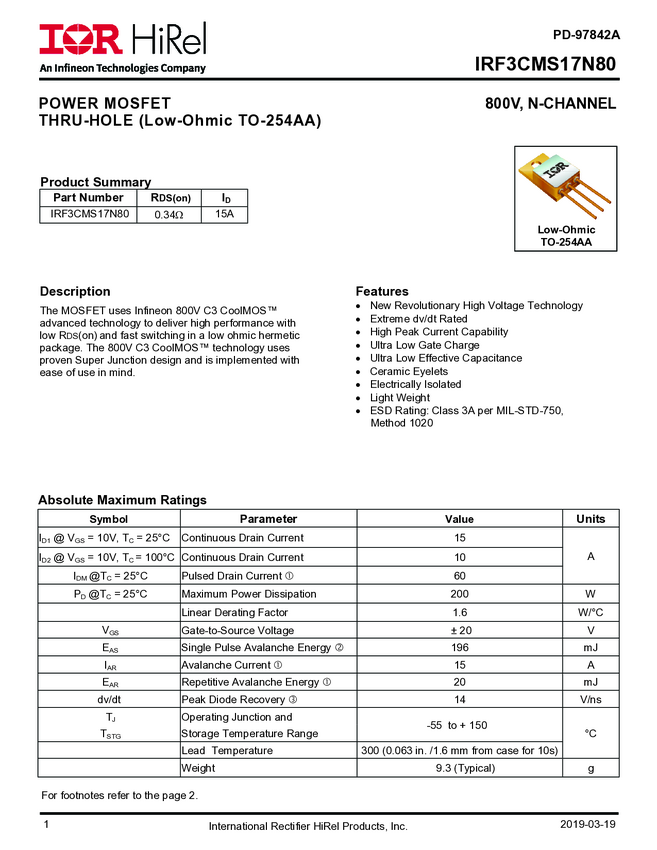 IRF3CMS17N80SCX is a high reliability, 800V, single, N-channel MOSFET in a TO-254AA low ohmic package. It utilizes HEXFET MOSFET technology to achieve low on-state resistance, high transconductance, and superior reverse energy and diode recovery dv/dt capability. Ideal for power supplies, motor controls, audio amplifiers, and other high-energy pulse circuit applications. It has TX level screening and is reliable for defense applications.