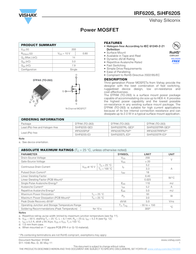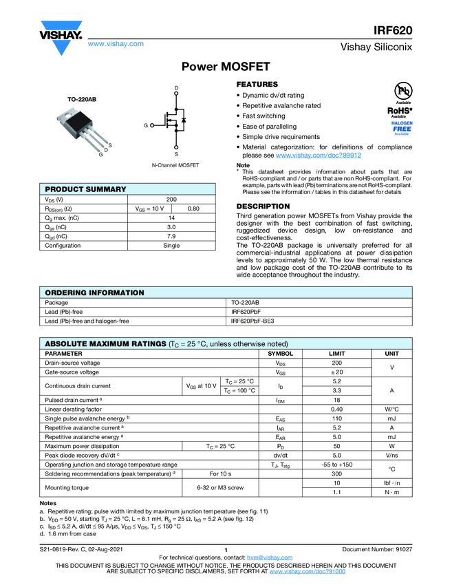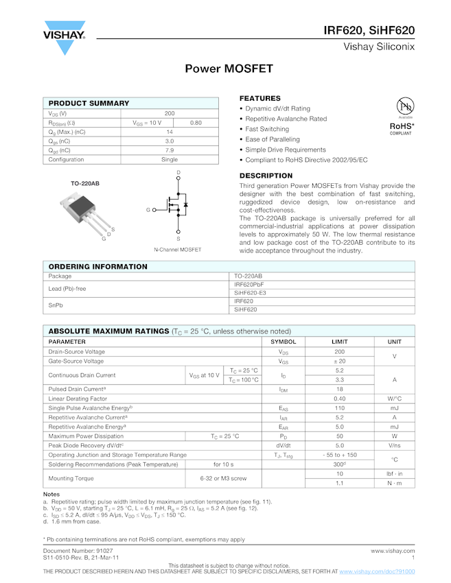 Tranzystor N-MOSFET, 5.2A, 200V, TO220