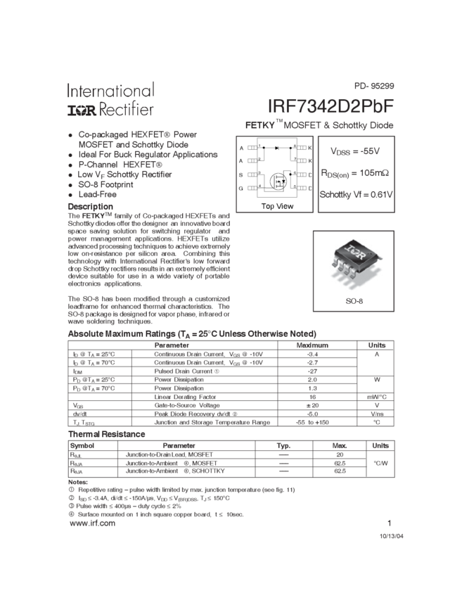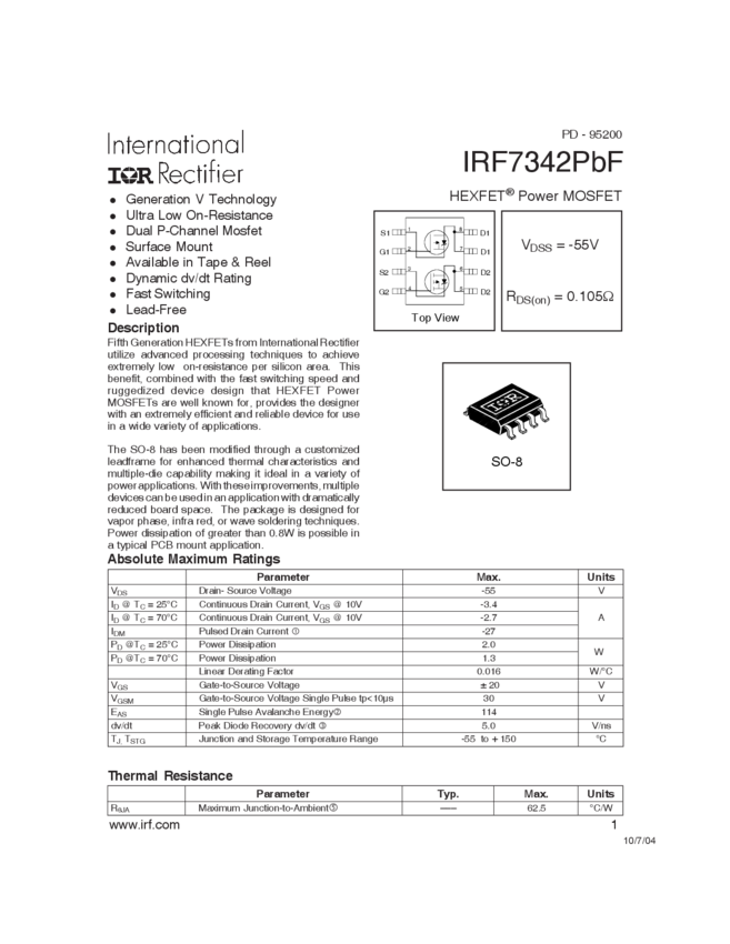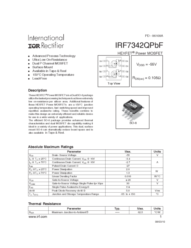 Tranzystor; IRF7342PBF; P-MOSFET x2; 3,4A; 55V; 2W; unipolarny; SO8; SMD; INFINEON; RoHS