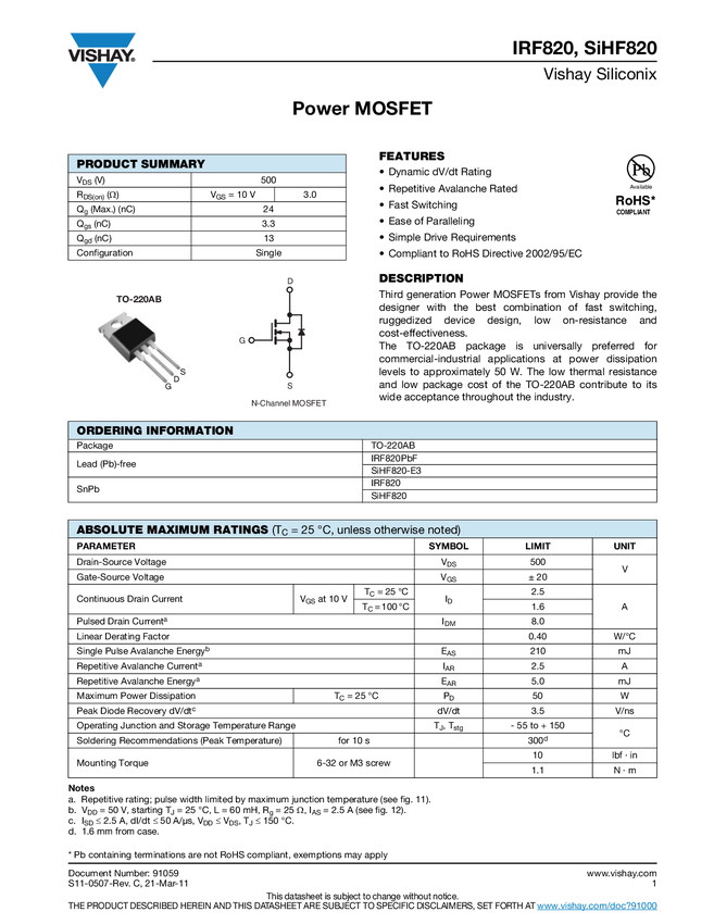 Vishay IRF820PBF N/A N/A IRF820PBF