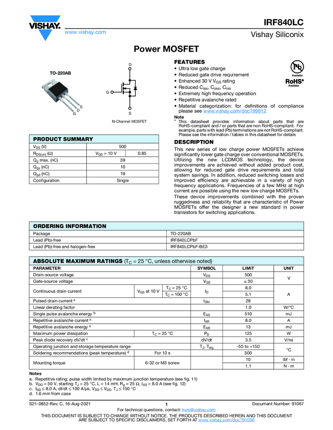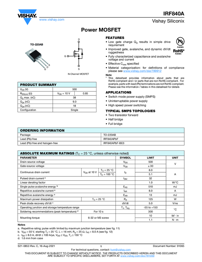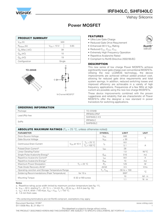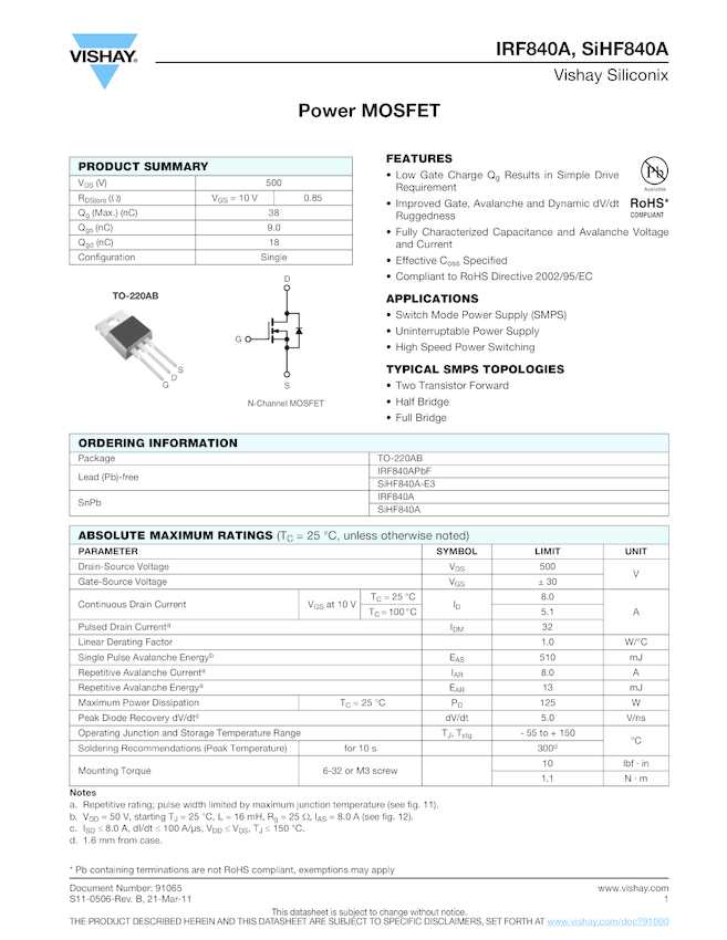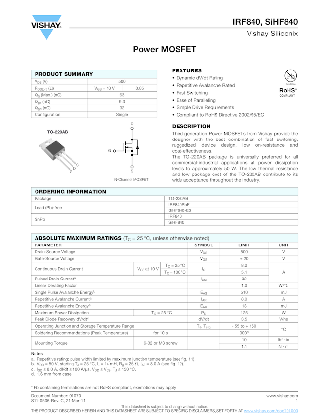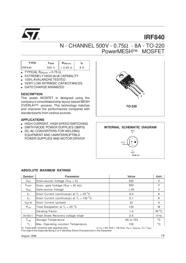 Tranzystor N-MOSFET, 8A, 500V, TO220