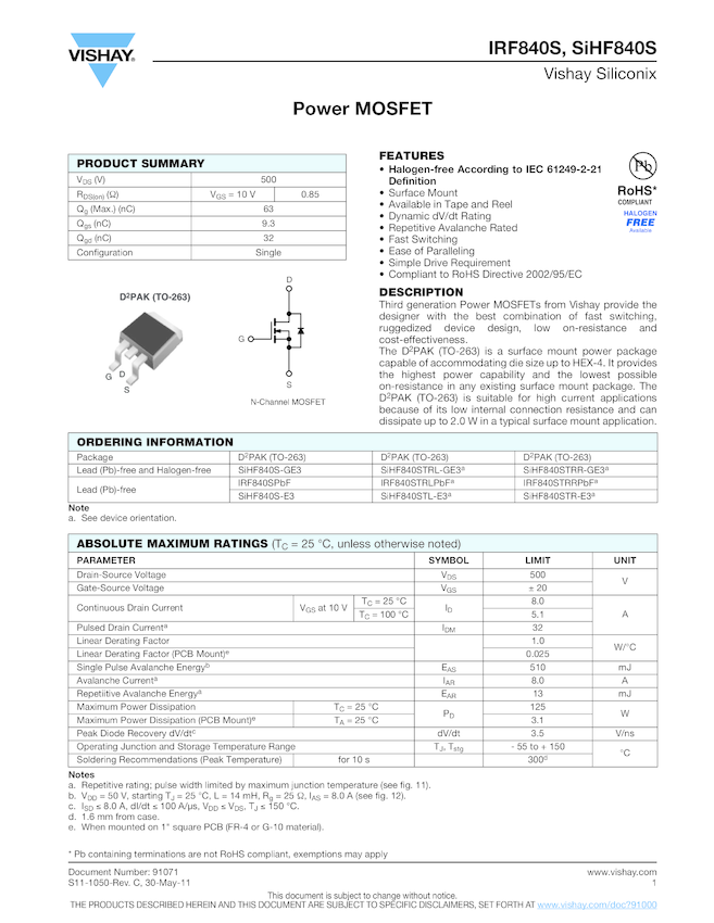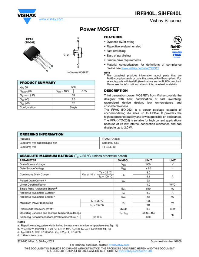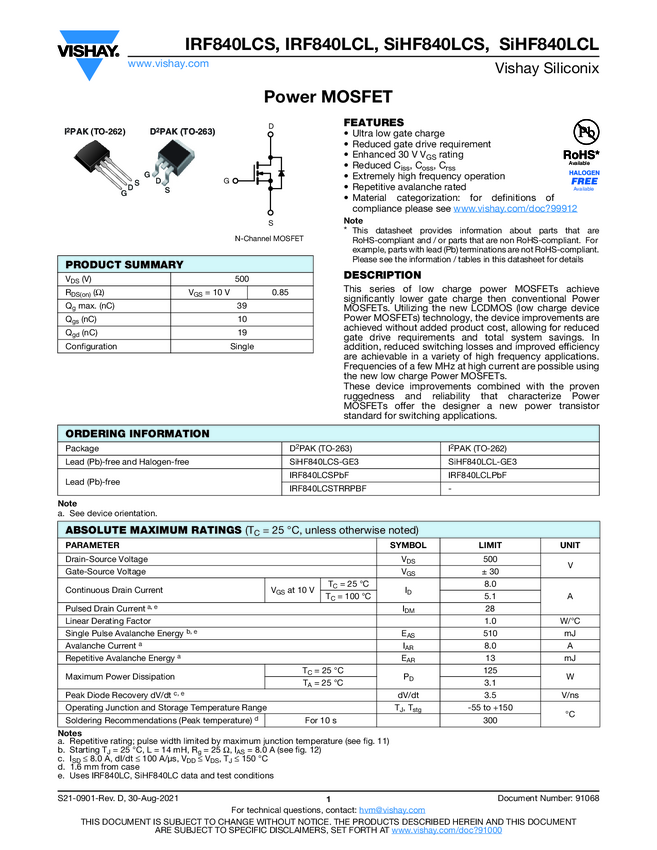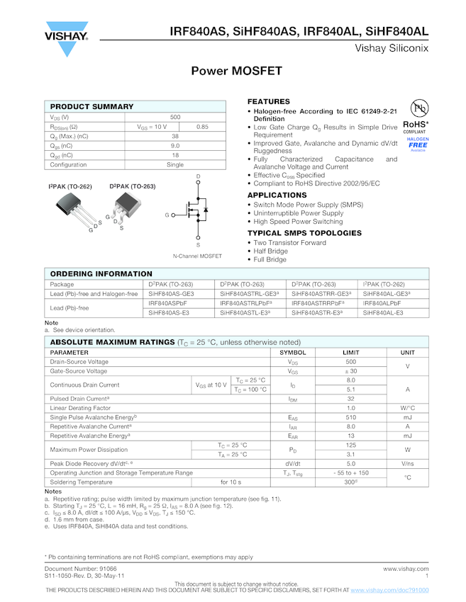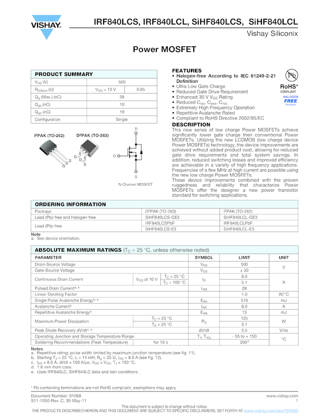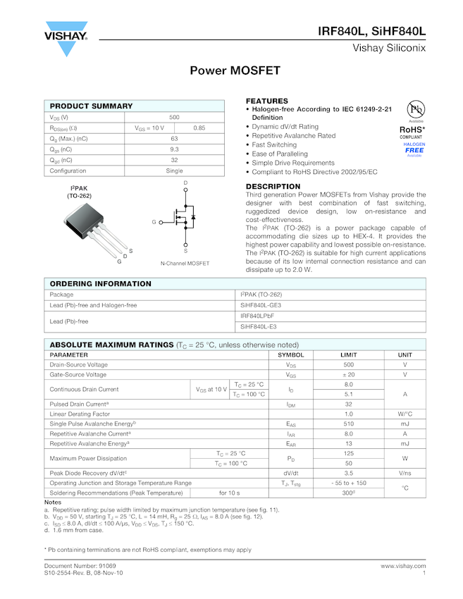 Tranzystor N-MOSFET, 8A, 500V, TO220