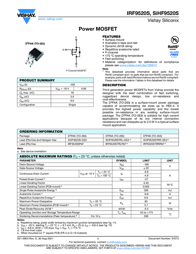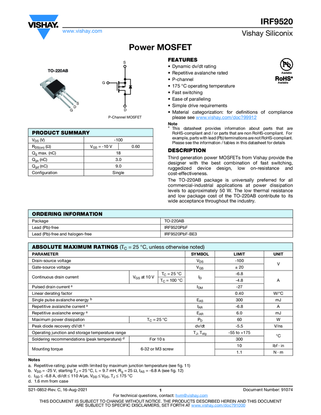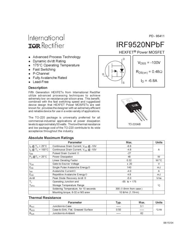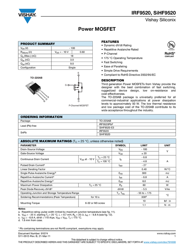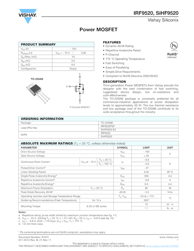 Tranzystor P-MOSFET, 6.8A, 100V, TO220