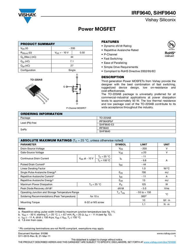 Vishay IRF9640PBF N/A N/A IRF9640PBF