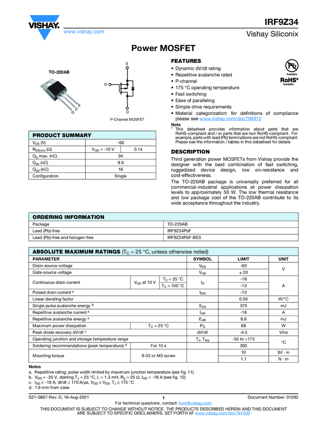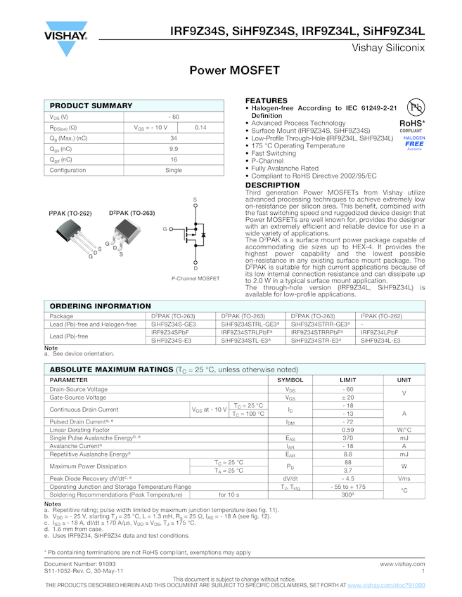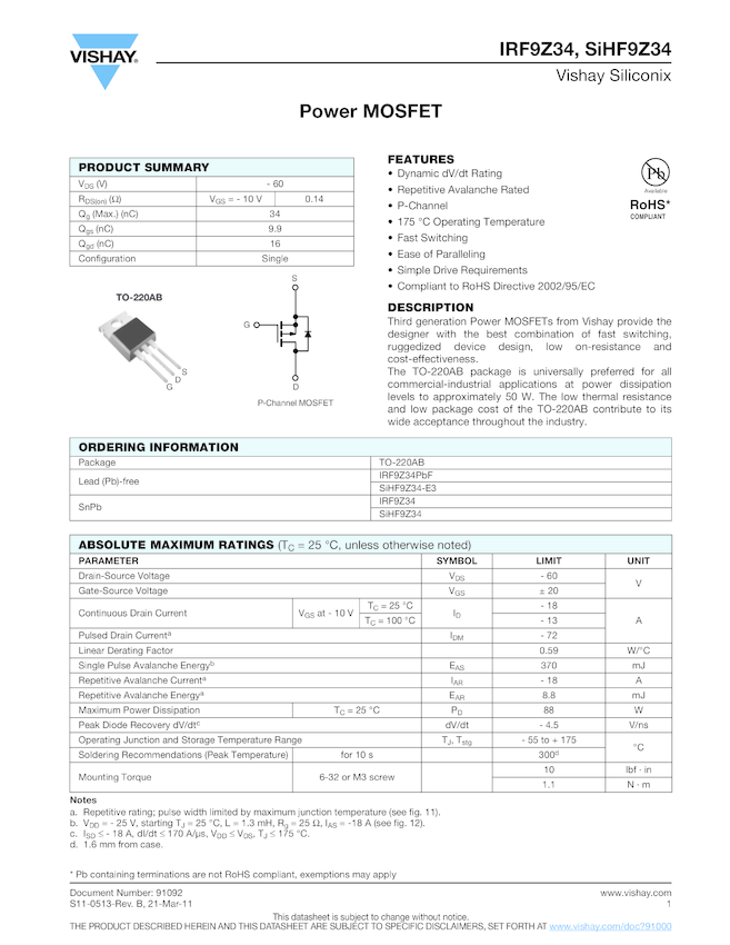 MOSFET Infineon Technologies IRF9Z34NPBF N/A N/A IRF9Z34NPBF