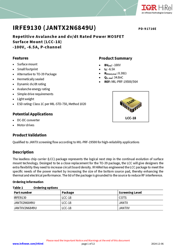 JANTXV2N6849U is a high reliability, -100V, single, P-channel MOSFET in a 18-pin LCC package. It utilizes HEXFET MOSFET technology to achieve low on-state resistance, high transconductance, and superior reverse energy and diode recovery dv/dt capability. Ideal for power supplies, motor controls, choppers, audio amplifiers, and other high-energy pulse circuit applications. It has TXV level screening and is suitable for defense applications.