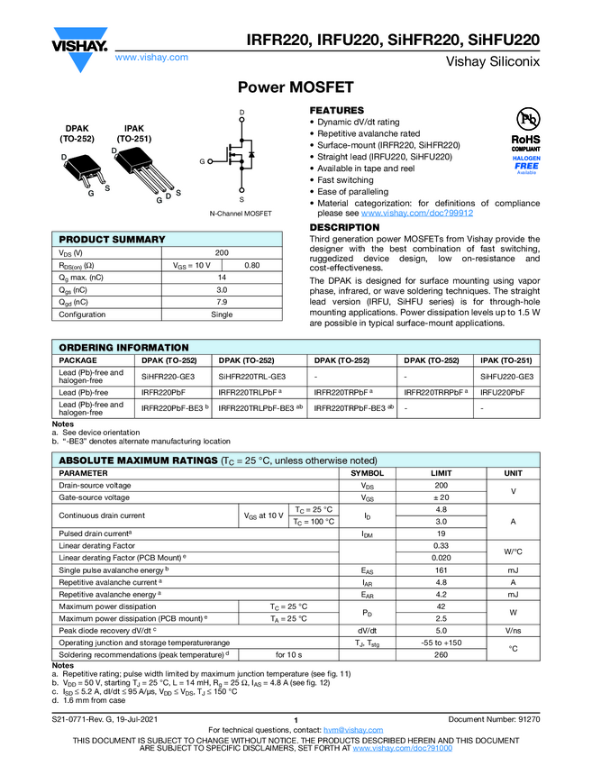 Power MOSFET, N-Channel, B-FET, 200 V, 4.6 A, 0.9 Ω, IPAK