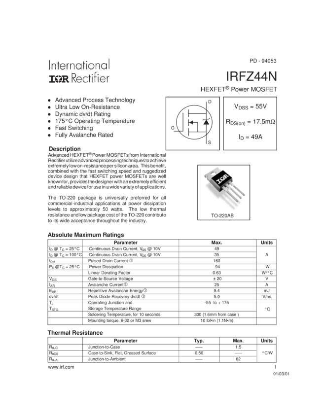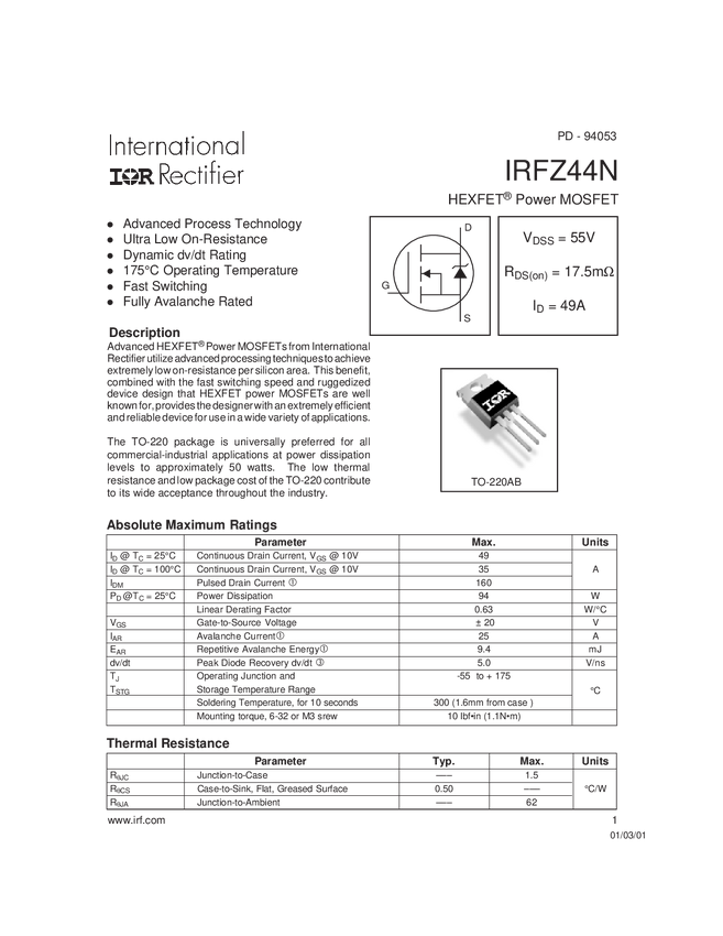 Tranzystor; IRFZ44NSPBF; 49A; 55V; 110W; N-MOSFET; unipolarny; HEXFET; D2PAK; TO263; SMD; INFINEON; RoHS