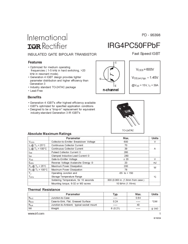 Tranzystor; IRG4PC50FD; IGBT; 70A; 600V; 200W; TO247AC; THT; INFINEON; IRG4PC50FDPBF; RoHS