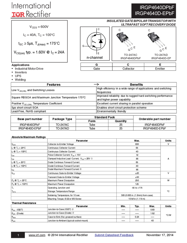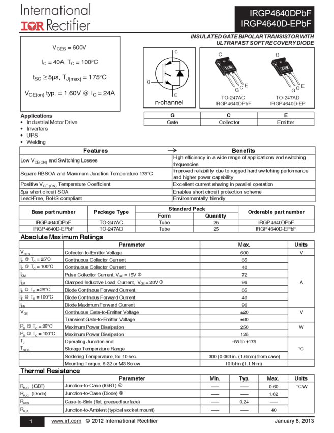 Tranzystor; IRGP4640D-EPBF; IGBT; 65A; 600V; 250W; TO247; INTERNATIONAL RECTIFIER; IRGP4640D-EPBF; RoHS