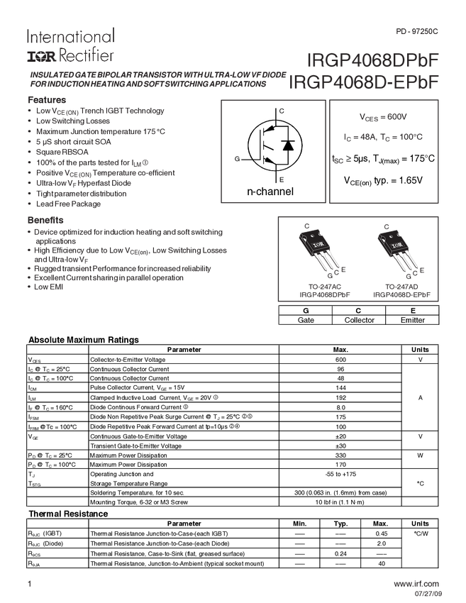 Tranzystor; IRGP4640DPBF; IGBT; 96A; 600V; 330W; TO247; THT; INTERNATIONAL RECTIFIER; RoHS
