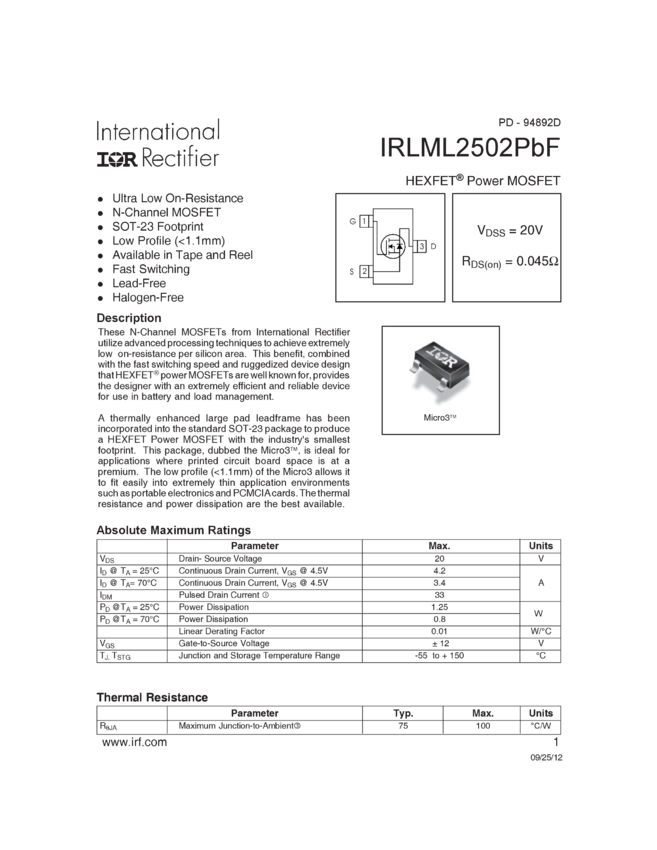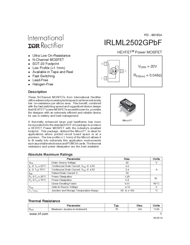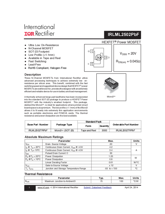 Tranzystor; IRLML2502TRPBF; N-MOSFET; 4,2A; 20V; 1,25W; unipolarny; logic level; SOT23; SMD; International Rectifier; RoHS; opakowanie/100szt
