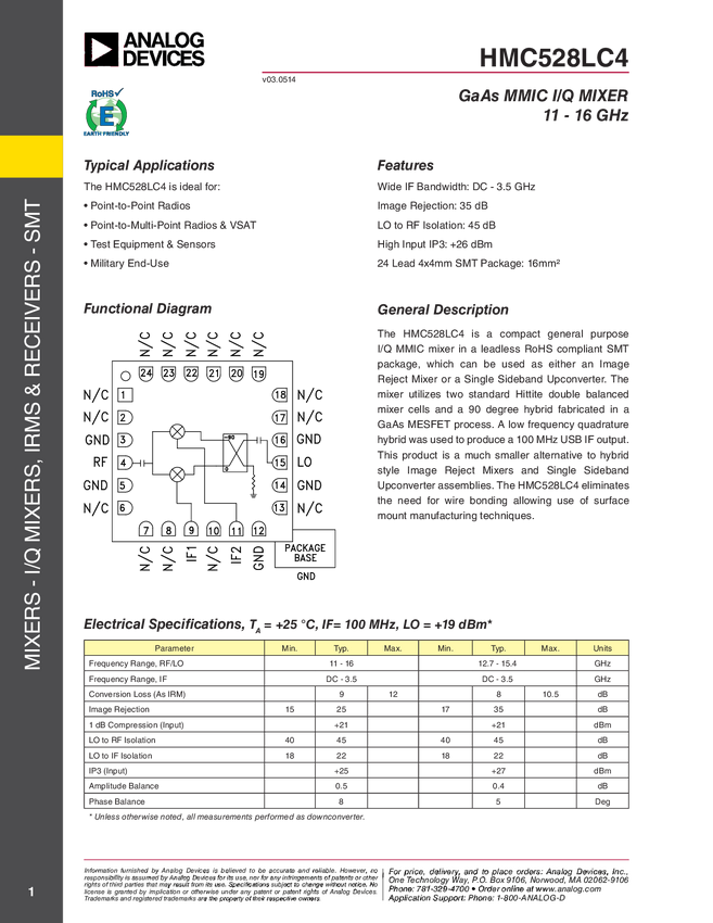 GaAsmonolithic microwave integrated circuit (MMIC) I/Q mixer, image reject mixer (IRM) chip and surface mount technology (SMT), 11 GHz to 16 GHz