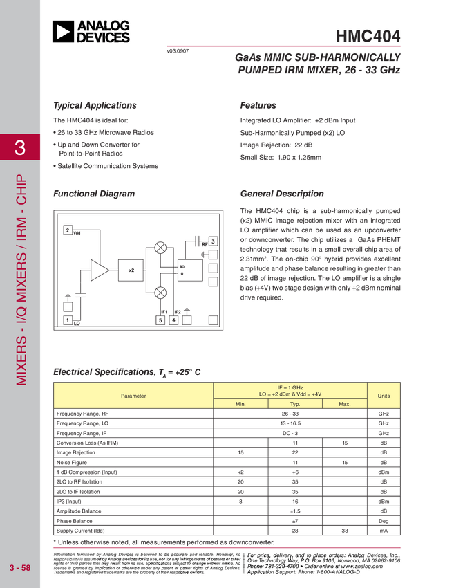 GaAs MMIC Sub Harmonic IRM Mixer Chip, 26 - 33 GHz
